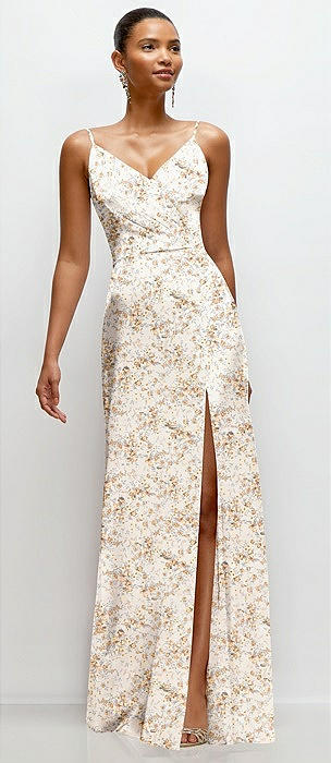 Floral Pleated Faux Wrap Satin Maxi Dress with Adjustable Spaghetti Straps in golden hour