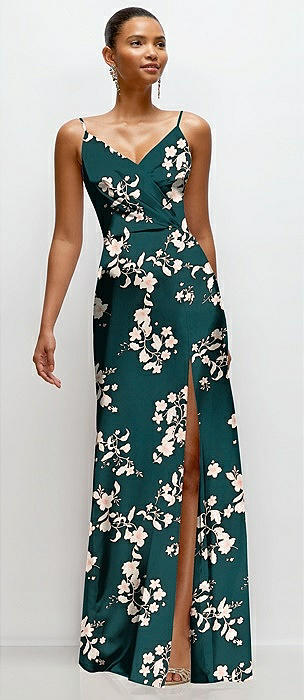 Floral Pleated Faux Wrap Satin Maxi Dress with Adjustable Spaghetti Straps in vintage primrose evergreen