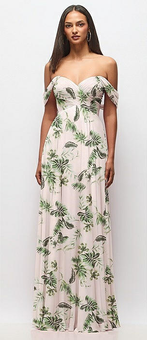 Off-the-Shoulder Draped Chiffon Maxi Dress in palm beach print
