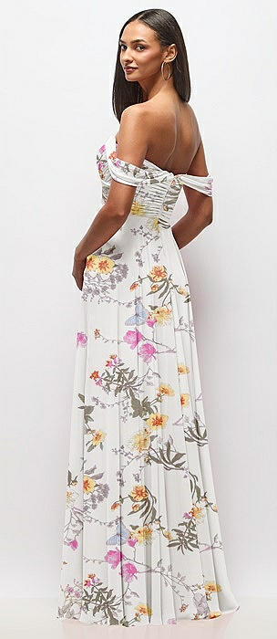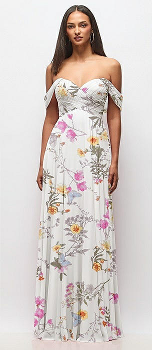 Off-the-Shoulder Draped Chiffon Maxi Dress in butterfly botanica ivory