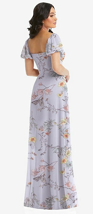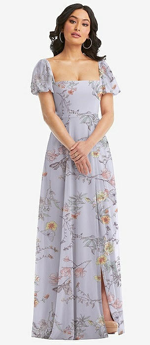 Puff Sleeve Chiffon Maxi Dress with Front Slit in butterfly botanica silver dove