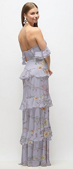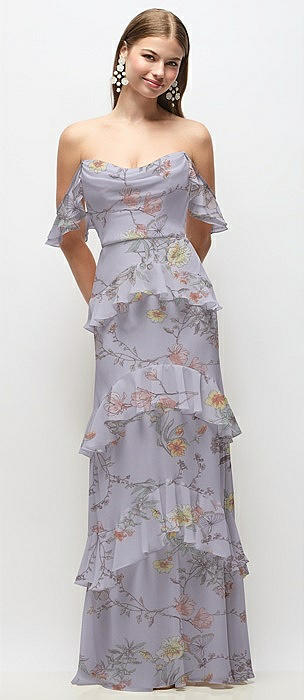 Off-the-Shoulder Cowl Floral Chiffon Tiered Ruffle Maxi Dress with Convertible Ruffle Straps in butterfly botanica silver dove