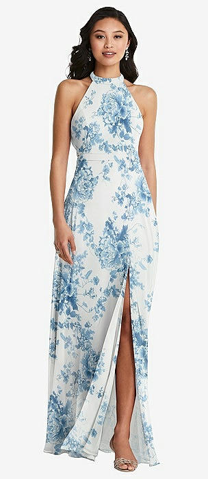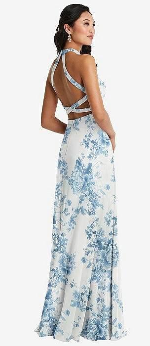 Stand Collar Halter Maxi Dress with Criss Cross Open-Back in cottage rose dusk blue
