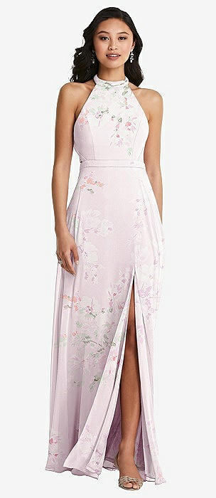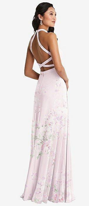 Stand Collar Halter Maxi Dress with Criss Cross Open-Back in blush garden