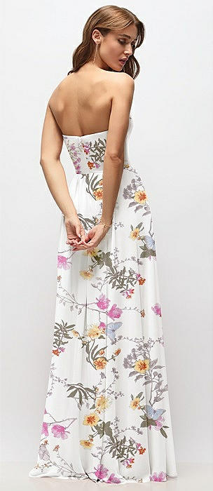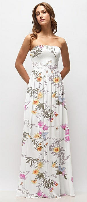 Strapless Basque Drop Waist Floral Chiffon Maxi Dress with Shirred Skirt in butterfly botanica ivory