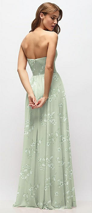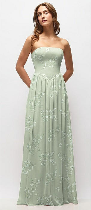Strapless Basque Drop Waist Floral Chiffon Maxi Dress with Shirred Skirt in vintage primrose sage