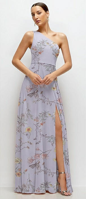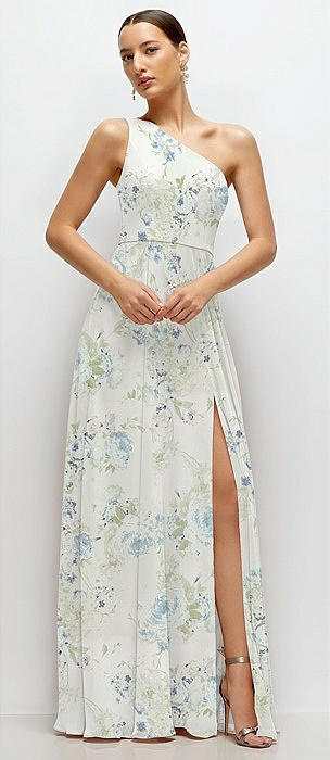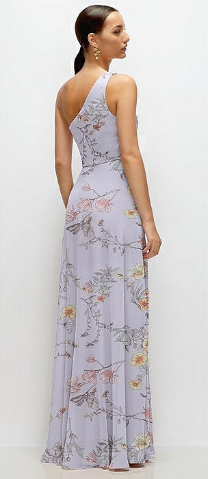 Chiffon One-Shoulder Maxi Dress with Circle Skirt in butterfly botanica silver dove
