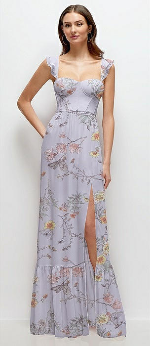Ruffle Strap Chiffon Bustier Maxi Dress with Ruffle Hem A-Line Skirt in butterfly botanica silver dove