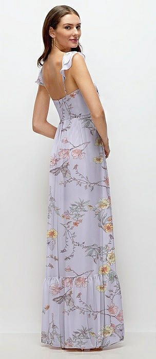 Bustier-Style Chiffon Tiered Ruffle Maxi Dress with Adjustable Straps in butterfly botanica silver dove