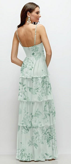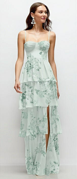 Bustier-Style Chiffon Tiered Ruffle Maxi Dress with Adjustable Straps in mint green floral