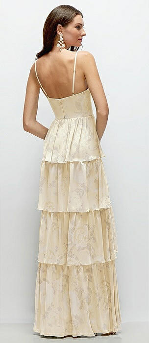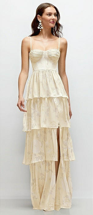 Bustier-Style Chiffon Tiered Ruffle Maxi Dress with Adjustable Straps in butter yellow floral