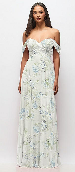 Off-the-Shoulder Draped Chiffon Maxi Dress in mint green floral
