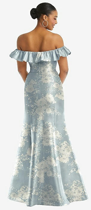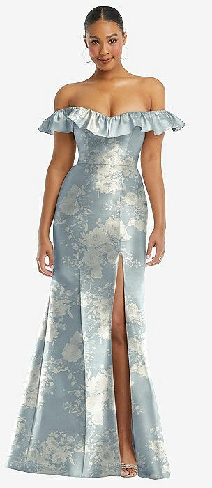 Off-the-Shoulder Ruffle Neck Floral Satin Trumpet Gown in cottage rose larkspur