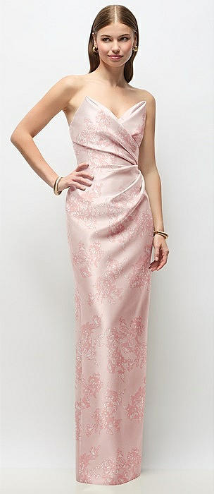 Strapless Asymmetrical Draped Satin Column Floral Maxi Dress in bow and blossom print