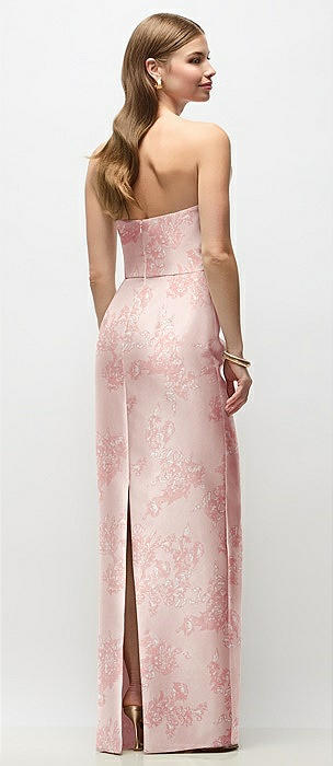 Strapless Cuff Floral Satin Maxi Dress with Column Skirt & Back Bow in butterfly botanica pink sand