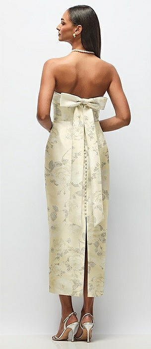 Strapless Cuff Floral Satin Midi Dress with Column Skirt & Back Bow in butter yellow floral