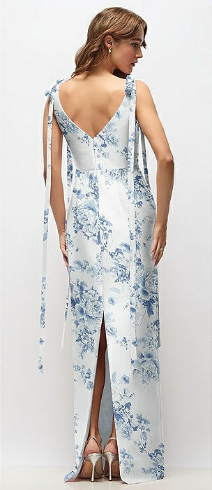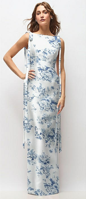 Floral Bateau Neck Satin Column Maxi Dress with Exaggerated Tail Bow Straps in bow and blossom print