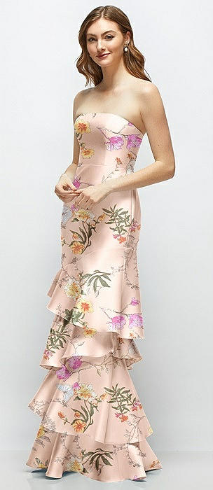 Floral Strapless Bodycon Maxi Dress with Tiered Ruffle Skirt in bow and blossom print