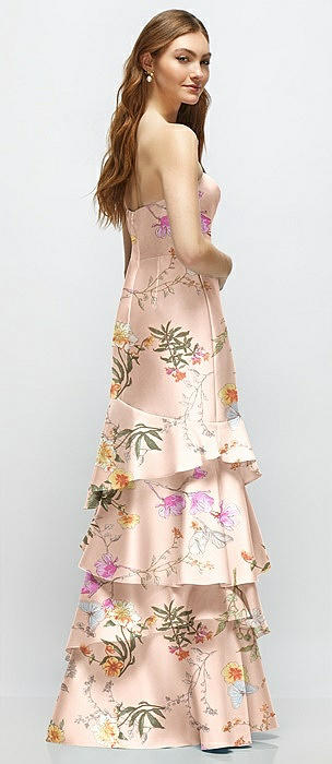 Floral Strapless Satin Drop Waist Gown with Full Skirt in butterfly botanica pink sand