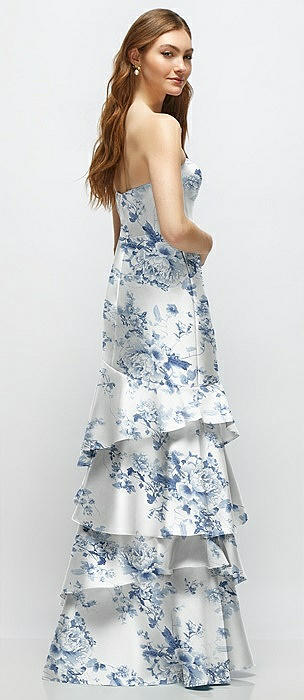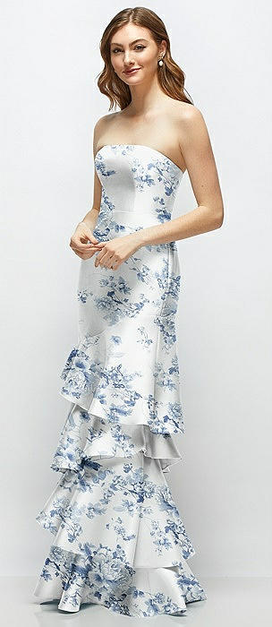 Floral Strapless Bodycon Maxi Dress with Tiered Ruffle Skirt in porcelain blue seraphina floral