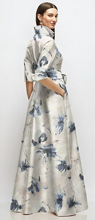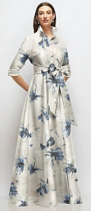 3/4 Sleeve Floral Satin Shirt Dress Gown with Sash and Jeweled Buttons in inkwash blue floral