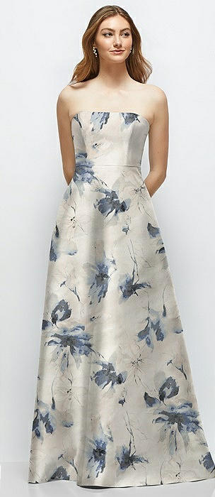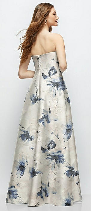 Strapless Floral Satin Gown with Full Skirt and Covered Buttons at Back in inkwash blue floral