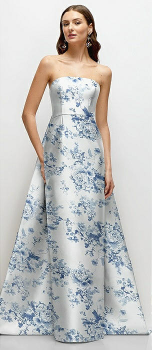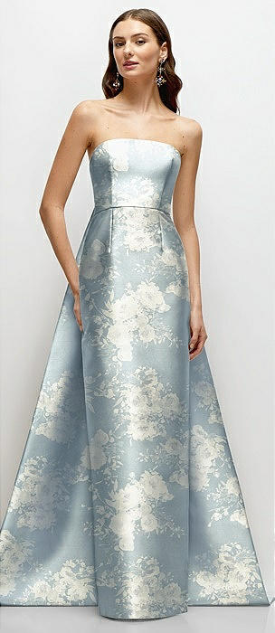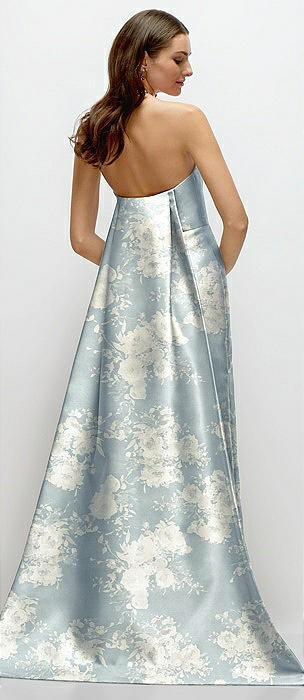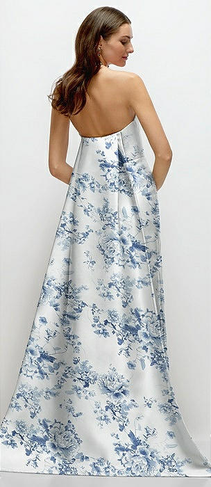 Strapless Floral Satin Column Dress with Removeable Watteau Train in porcelain blue seraphina floral