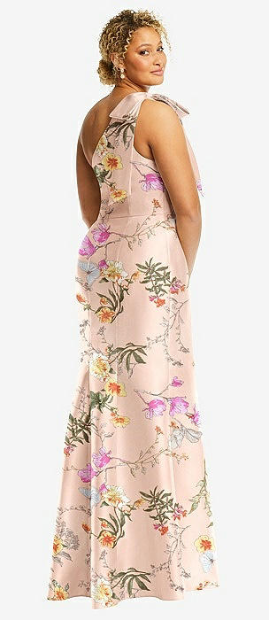 Deep V-back Floral Satin Trumpet Dress with One-Shoulder Cascading Bow in butterfly botanica pink sand