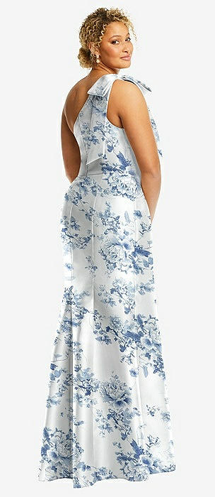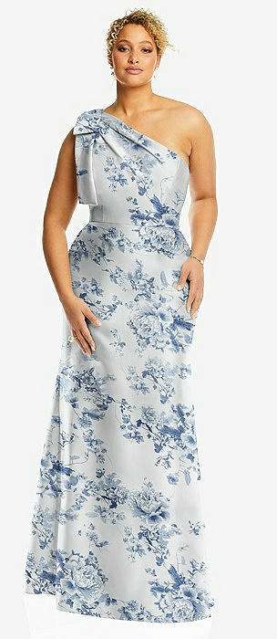Bow One-Shoulder Floral Satin Trumpet Gown in cottage rose larkspur