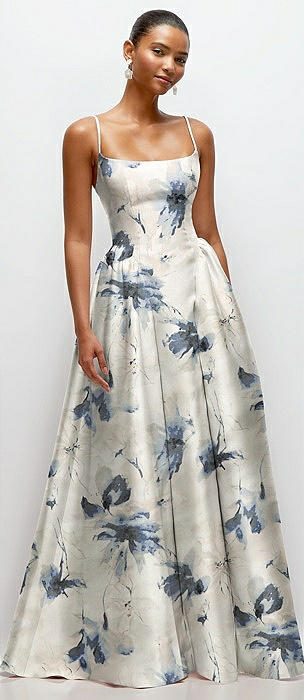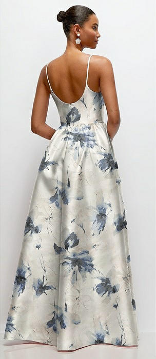 Scoop Neck Drop Basque Skirt Floral Satin Maxi Dress with Pockets in inkwash blue floral