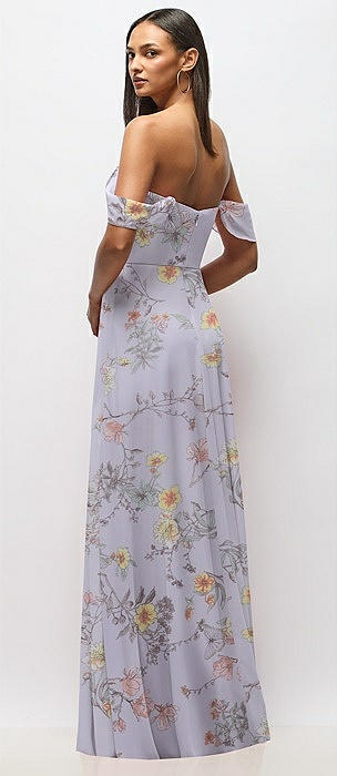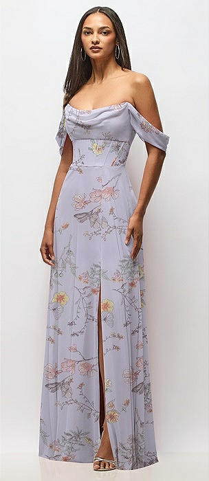 Chiffon Corset Maxi Dress with Removable Off-the-Shoulder Swags in butterfly botanica silver dove