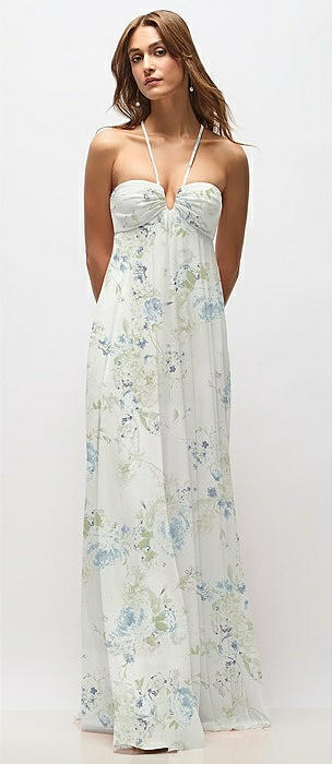 Empire Waist Floral Chiffon Halter Maxi Dress with Convertible Spaghetti Straps in bleu garden