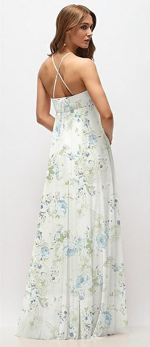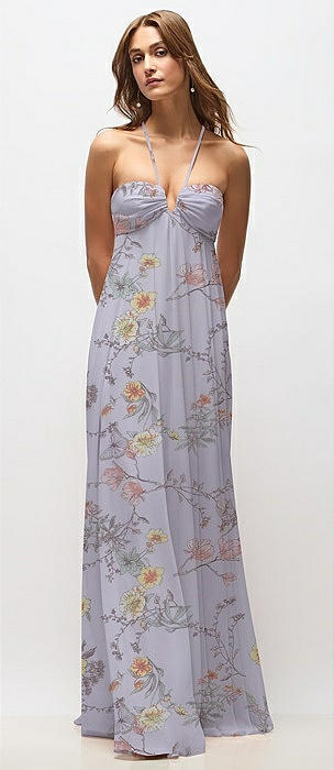 Empire Waist Floral Chiffon Halter Maxi Dress with Convertible Spaghetti Straps in butterfly botanica silver dove