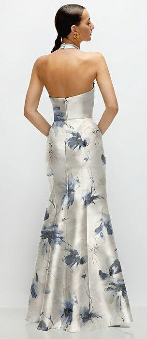 High-Neck Halter Open-Back Floral Satin Trumpet Dress in inkwash blue floral