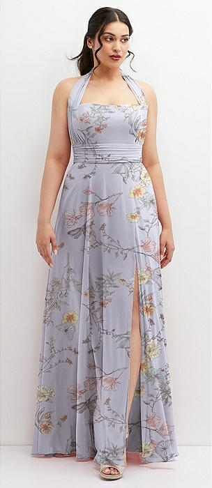 Shirred Skirt Jewel Neck Halter Dress with Front Slit in butterfly botanica silver dove