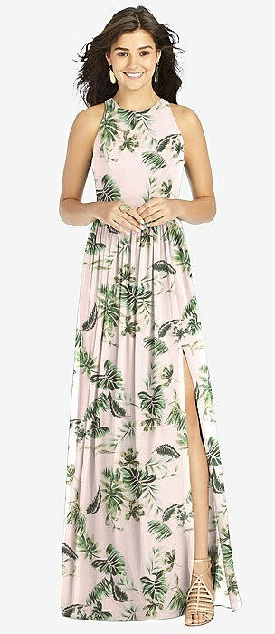 Shirred Skirt Jewel Neck Halter Dress with Front Slit in blush garden