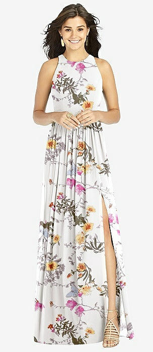Shirred Skirt Jewel Neck Halter Dress with Front Slit in butterfly botanica ivory