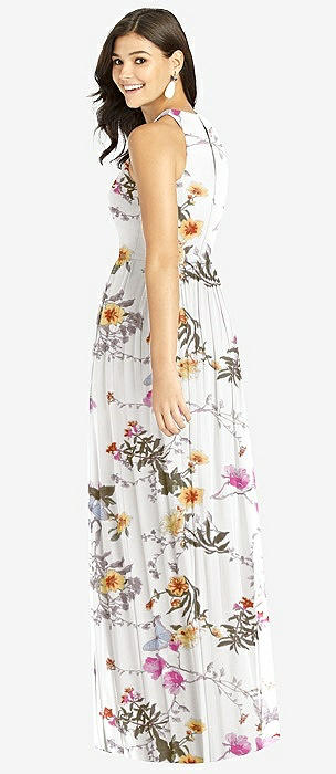 Shirred Skirt Jewel Neck Halter Dress with Front Slit in butterfly botanica silver dove