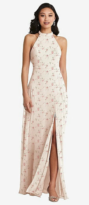 Stand Collar Halter Maxi Dress with Criss Cross Open-Back in coquette floral print