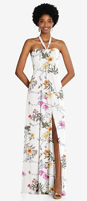 Stand Collar Halter Maxi Dress with Criss Cross Open-Back in butterfly botanica ivory