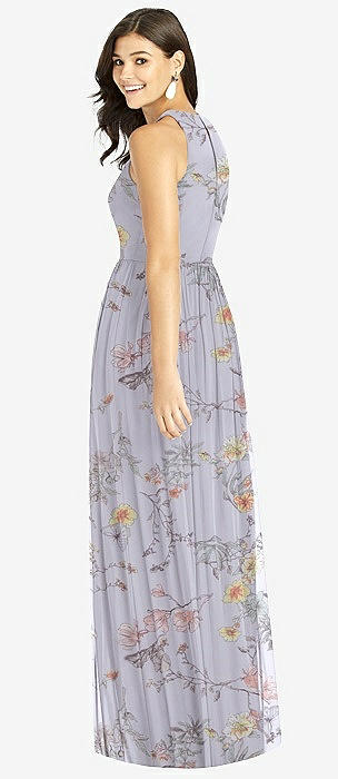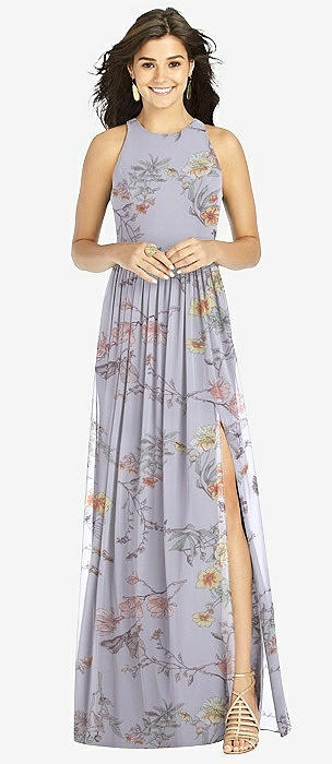 Shirred Skirt Jewel Neck Halter Dress with Front Slit in butterfly botanica silver dove