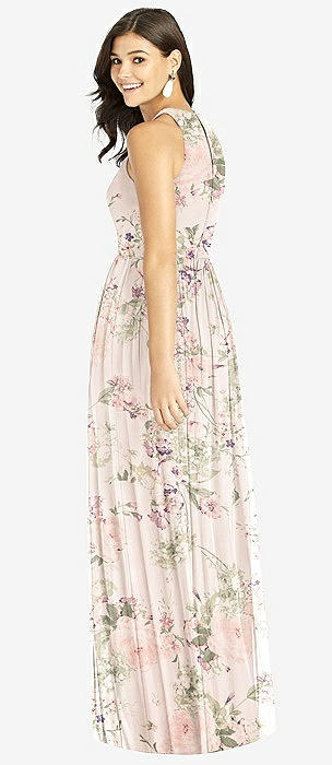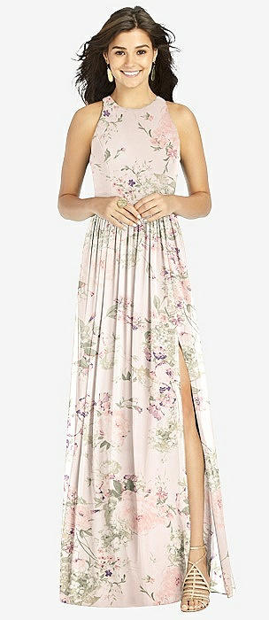 Shirred Skirt Jewel Neck Halter Dress with Front Slit in blush garden