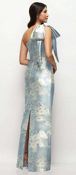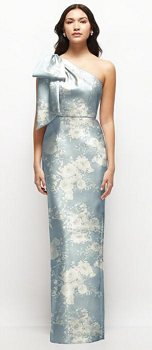 Oversized Bow One-Shoulder Floral Satin Column Maxi Dress in cottage rose larkspur
