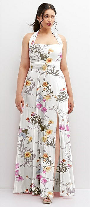 Draped Chiffon Grecian Column Gown with Convertible Straps in watercolor print