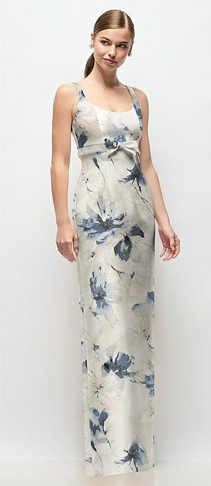 Scoop Neck Floral Satin Column Maxi Dress with Bow at Empire Waist in inkwash blue floral