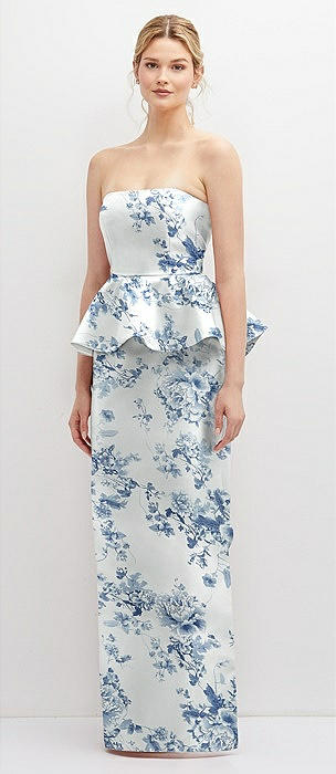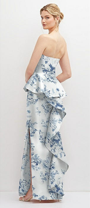 Floral Strapless Satin Maxi Dress with Cascade Ruffle Peplum Detail in bow and blossom print