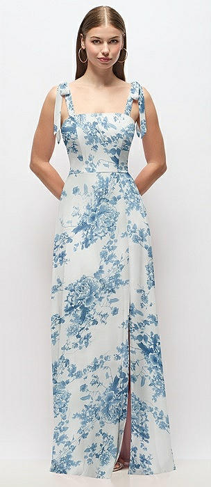 Tie-Shoulder Chiffon Maxi Dress with Front Slit in cottage rose dusk blue