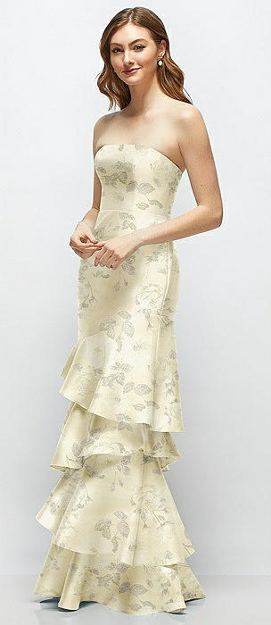 Floral Strapless Bodycon Maxi Dress with Tiered Ruffle Skirt in butter yellow floral