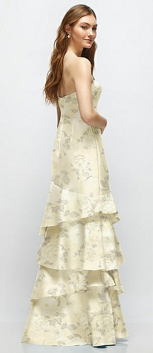 Strapless Floral Satin Gown with Full Skirt and Covered Buttons at Back in butter yellow floral