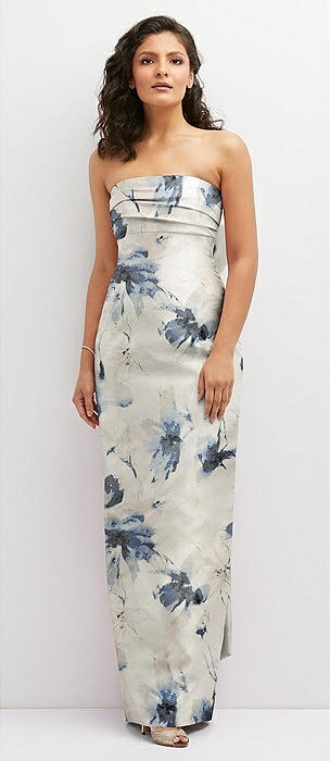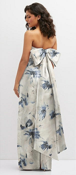 Floral Strapless Draped Bodice Column Dress with Oversized Bow in inkwash blue floral